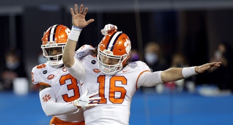 CHARLOTTE, NORTH CAROLINA - DECEMBER 19: Quarterback Trevor Lawrence #16 of the Clemson Tigers celebrates with wide receiver Amari Rodgers #3 after scoring a 34-yard rushing touchdown in the third quarter against the Notre Dame Fighting Irish during the ACC Championship game at Bank of America Stadium on December 19, 2020 in Charlotte, North Carolina. (Photo by Jared C. Tilton/Getty Images)